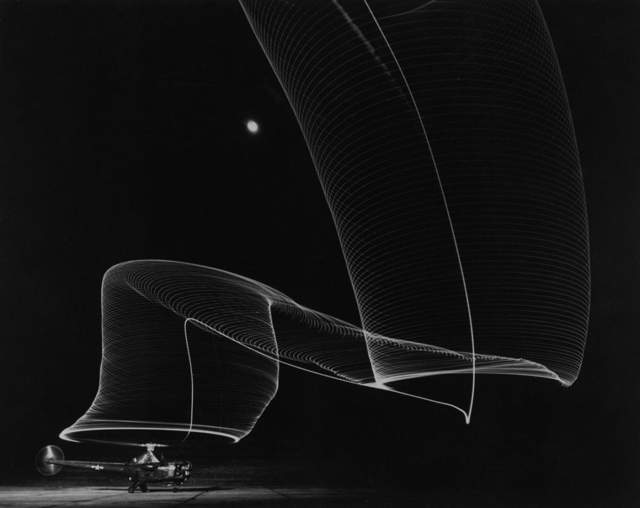 Andreas Feininger. Slinky-like light pattern in the blackness of a moonlit sky produced by a time-exposure of the light-tipped rotor blades of a grounded helicopter as it takes off, 1949.