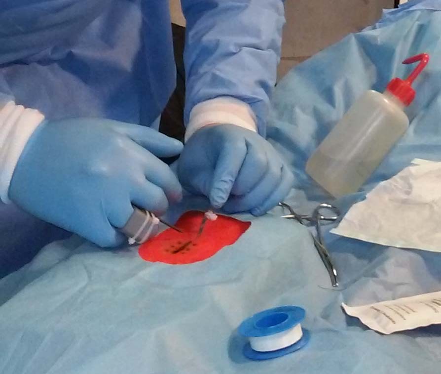 Closeup view of the 3D printed scalpel handle (right hand) and “claw” (left hand)