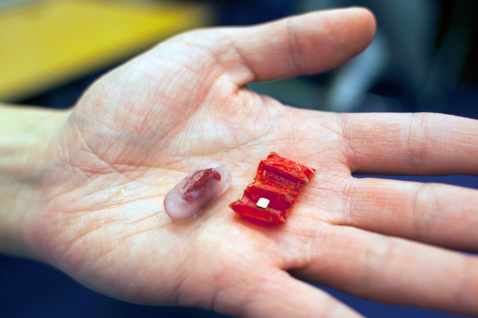 A folding robot made of pig parts that removes batteries from stomachs with magnets Researchers from MIT, the University of…