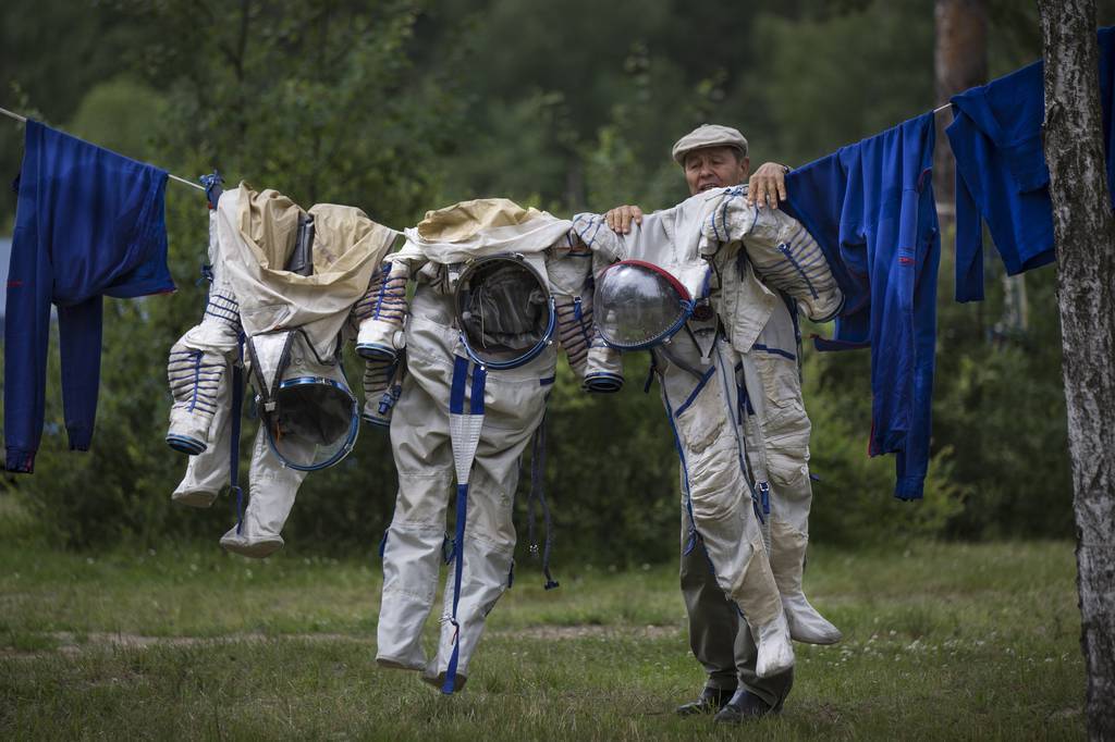 An employee of the Russian Space Training Center near Noginsk, Russia, hung the space suits of Russia’s Anatoly Ivanishin, NASA flight engineer Kathleen Rubins, and Takuya Onishi of Japan after their training on July 2. Alexander Zemlianichenko/Associated Press