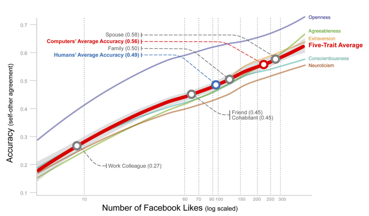“Compared with the accuracy of various human judges reported in the meta-analysis, computer models need 10, 70, 150, and 300 Likes, respectively, to outperform an average work colleague, cohabitant or friend, family member, and spouse (graypoints) […]